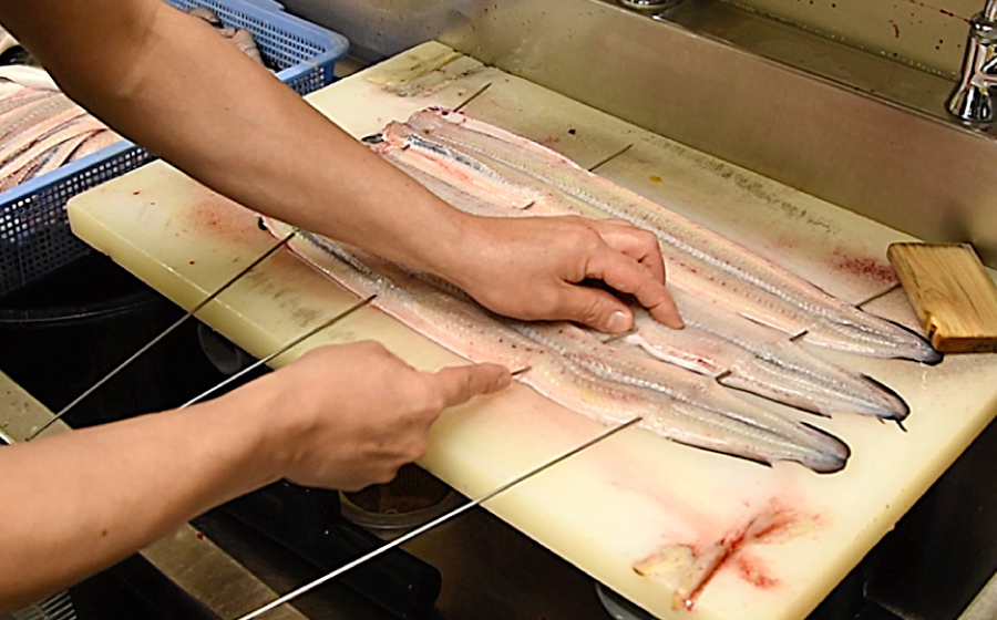 身を開き内臓を取った後に中骨と身の間に包丁を入れ、中骨をはがし尾といっしょに切り落とします。