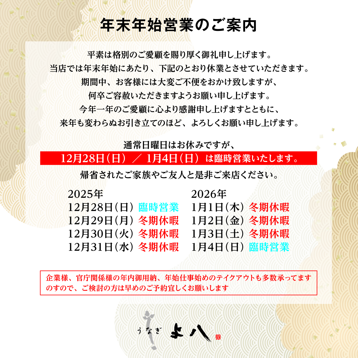 当店では年末年始にあたり、下記のとおり